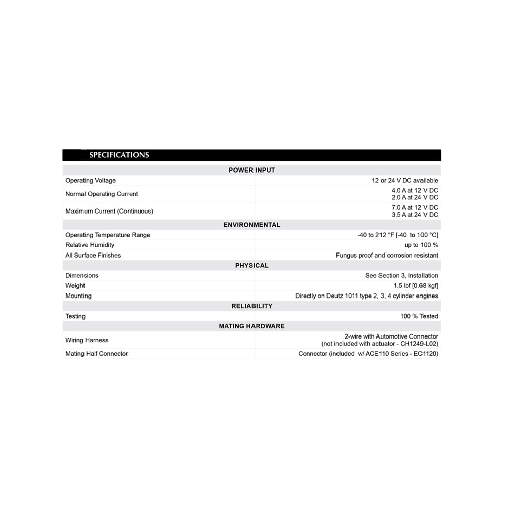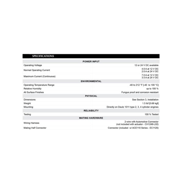 The GAC 110 Series Integral Actuator is designed to mount directly to DEUTZ 1011 Series 2, 3, and 4 cylinder engines in place of the electric stop solenoid and is available in 12 and 24 V DC. This unique, optimum fuel control, actuating device outperforms externally mounted types of electric actuators. An integral high performance speed control system results when the 110 Series Electric Actuator is installed on the engine and electrically connected to complementing governor system components. No external linkages or brackets are required.